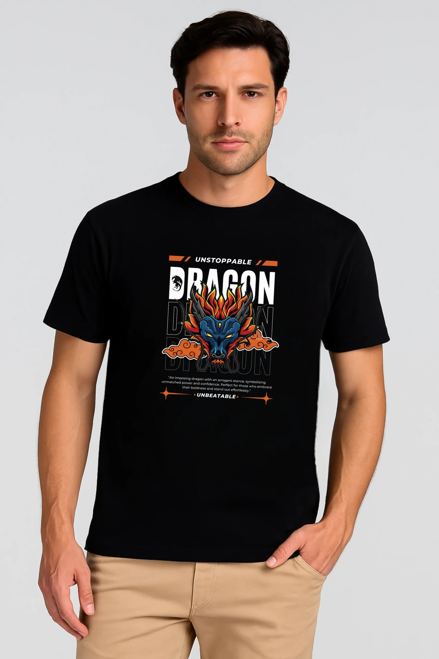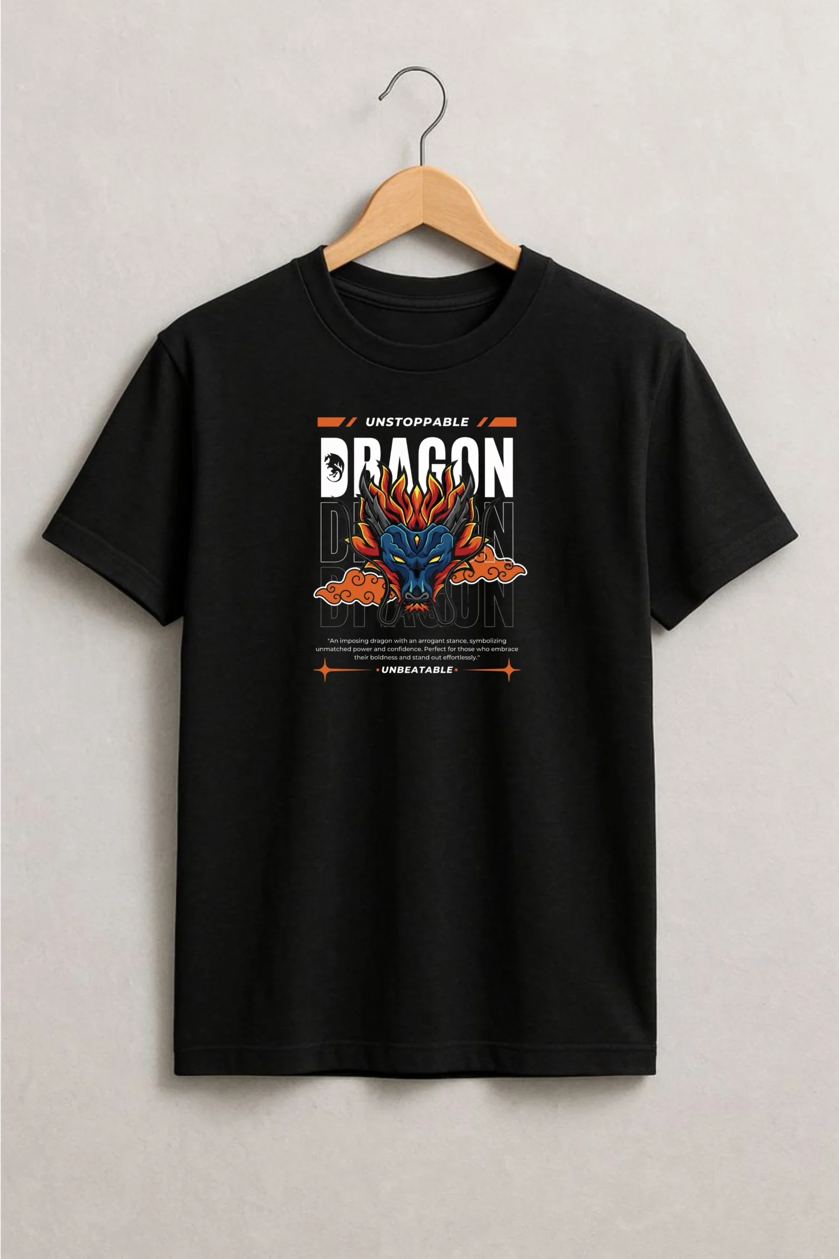 Unleash your fearless spirit with the Black Men’s Regular Fit Unstoppable Dragon T-Shirt — a fusion of raw power and everyday comfort. Crafted from lightweight 100% cotton at 180 gsm with a durable lycra ribbed neck, it delivers a breathable fit that’s built to move with you. The high-quality DTF Unstoppable Dragon graphic blazes with bold energy, making this more than just a tee — it’s your armor for the streets.